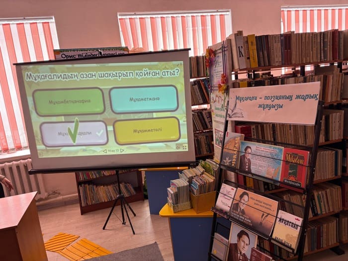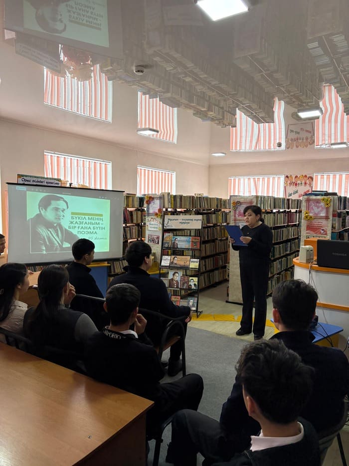 Балалар кітапханасында қазақтың көрнекті ақыны Мұқағали Сүлейменұлы Мақатаевтың туғанына 95 жыл толуына орай «Мұқағали-поэзияның жарық жұлдызы» атты поэзия кеші өткізілді. Мақсаты: ақынның өмірі мен шығармашылығын кеңінен насихаттау, жас ұрпақтың поэзияға деген сүйіспеншілігін арттыру, ақын өлеңдері арқылы адамгершілікке, отансүйгіштікке, рухани байлыққа тәрбиелеу.